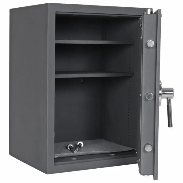 Der Rottner Wertschutzschrank Toscana 65 ist ein der Sicherheitsstufe EN-1 nach CSN EN-1 1143-1 entsprechender Tresor mit bedingtem Feuerschutz durch ringsumlaufenden Feuerfalz. Das batteriebetriebene Elektronikschloss ist einfach in der Bedienung und kann Notbestromt werden, besitzt jedoch keine Schlüsselöffnung. Für den leichten Überblick über die Wertgegenstände und Dokumente in seinem Inneren sorgen die beiden verstellbaren Fachböden – bis zu 7 Ordner finden Platz. Auch die Lagerung von Kurzwaffen ist aufgrund der Sicherheitsstufe erlaubt. Mit dem Toscana 65 haben Sie den optimalen Schutz für Ihre Dokumente und Wertpapiere.