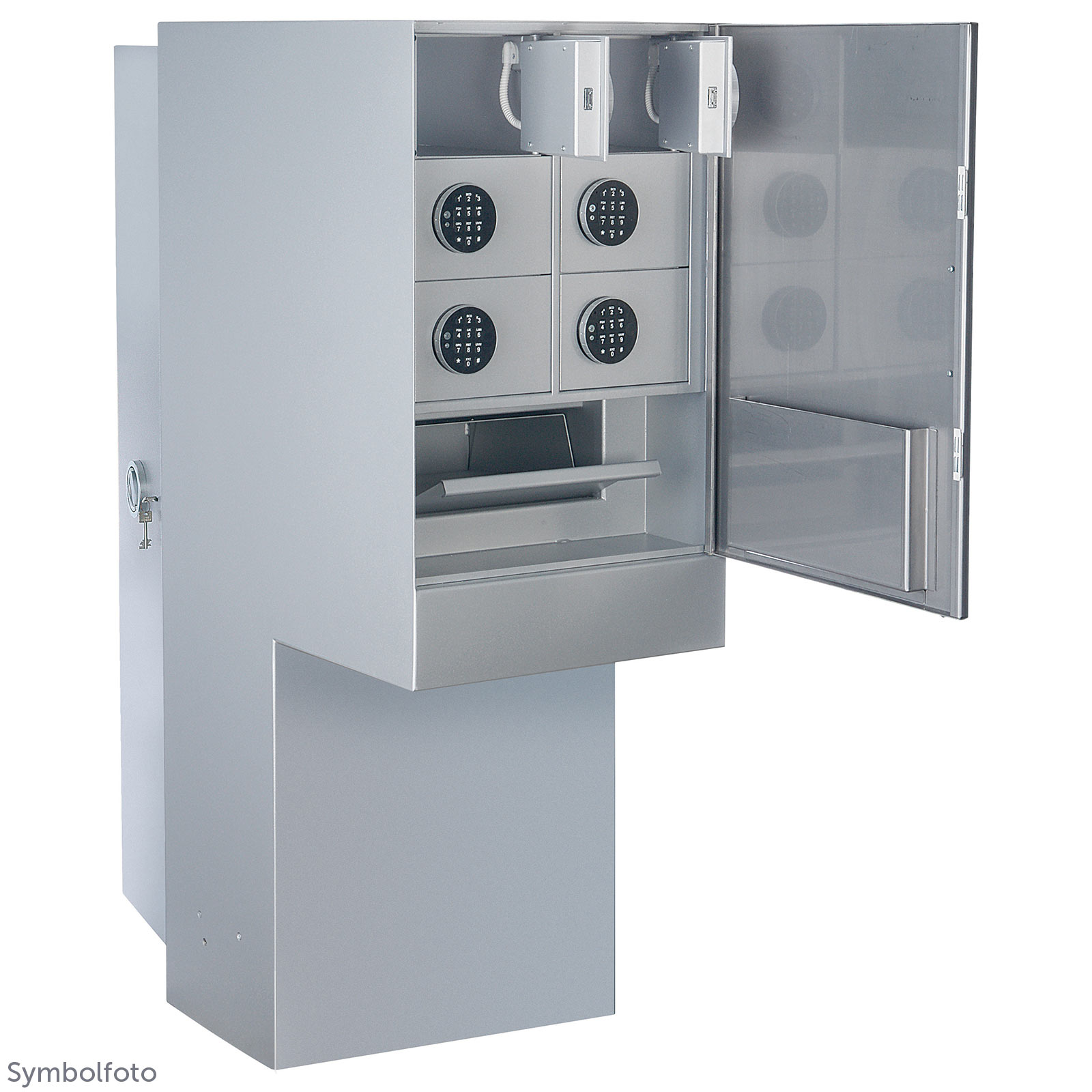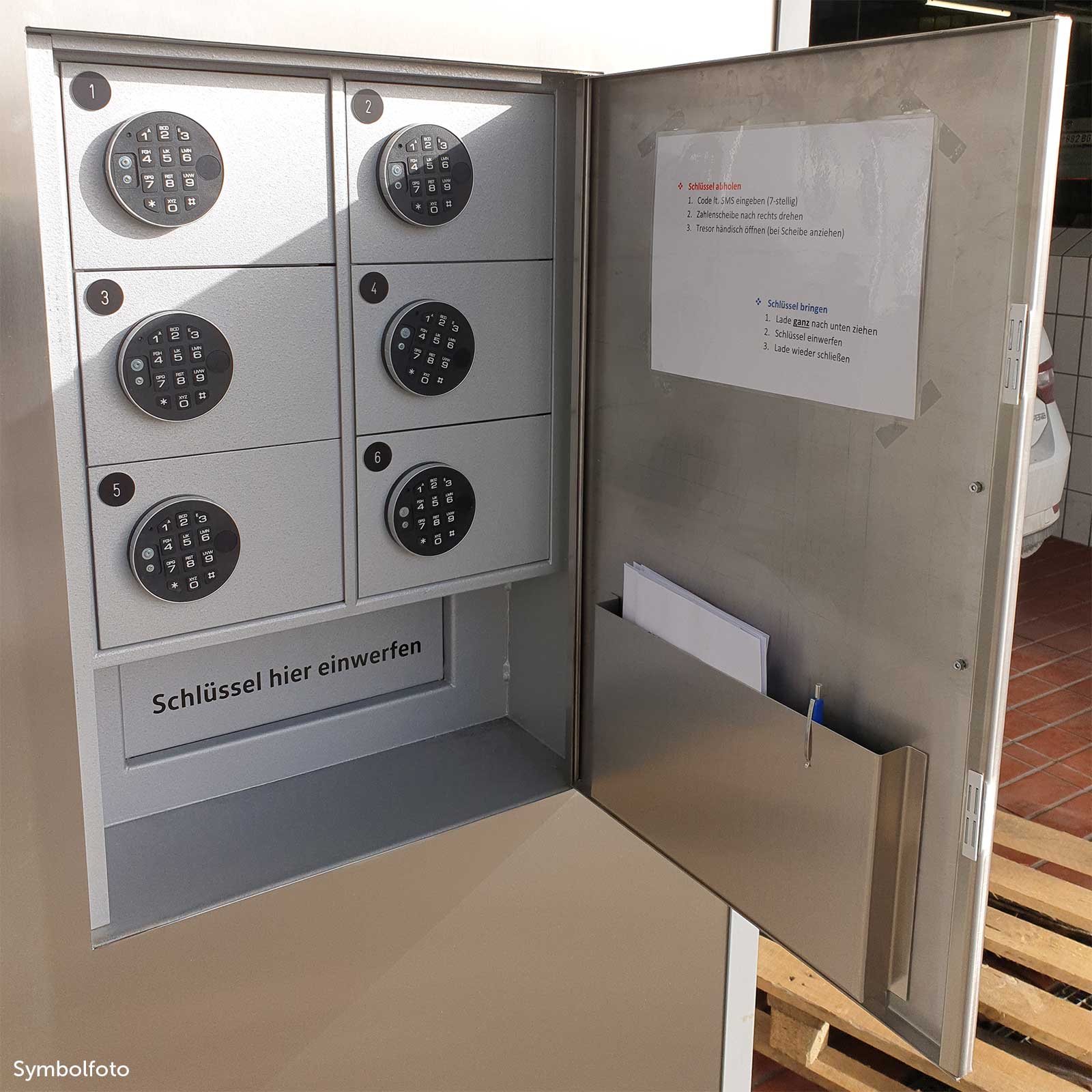 Dieser Autohaus-Tresor ist mit einem aufgesetzten Einwurfsystem und einem An- und Ausgabefach ausgestattet. Sechs nummerierte Ausgabefächer stehen zur Verfügung und befinden sich hinter einer rostfreien Edelstahltüre, die allen Wetterverhältnissen Stand hält. Die Edelstahltüre verdeckt den Einwurfschacht und die Fächer. Auf der Abdecktüre befindet sich ein Fach für Kuvert und Schreibunterlagen. Wenn Sie die Haupttüre auf der Rückseite öffnen, dann haben Sie Zugang zu allen Fächern und können Sie befüllen, ohne jeweils ein einzelnes Fach öffnen zu müssen. Ihr Kunde enthält von Ihnen den Code – Telefon oder SMS – und Sie hinterlegen den Schlüssel für ein Leihauto im angegebenen Fach. Sobald der Kunde den Code eintippt, kann er den Schlüssel/Fahrzeugpapiere herausnehmen. Bei der Rückgabe gibt er den Schlüssel/Papiere in ein Kuvert (Umschläge befinden sich in einem Staufach neben der Service-Anlage) und wirft das Kuvert in den Einwurfschacht. Eine Rückholsperre verhindert, dass der Inhalt wieder herausgefischt werden kann. Die Schlüssel/Autopapiere entnehmen Sie im Auffangbehälter – Zugang wiederum durch die Haupttüre. Bei diesem Modell ist die Haupttür mit einem Doppelbart-Hochsicherheitsschloss ausgestattet, 2 Schlüssel inkl.