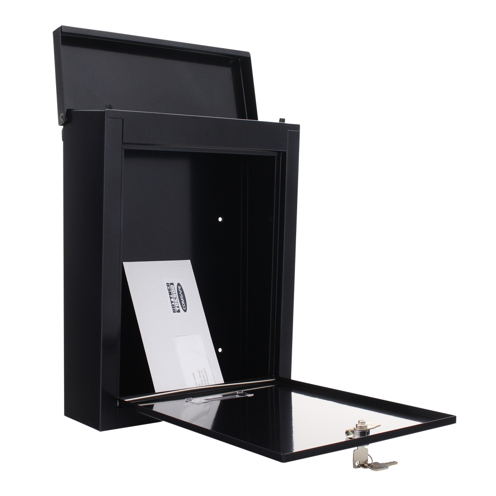 Der schwarze Rottner Briefkasten Brighton aus pulverbeschichtetem Stahlblech mit waagrechter Klappe besticht mit seinen schlichten Linien und Formen. Damit Sie Ihr Namensschild am Briefkasten anbringen können, finden Sie am Sichtfenster eine Namensschildhalterung. Das Montagematerial für den Briefkasten liegt mit einer Bohranleitung dem Lieferumfang bei.
