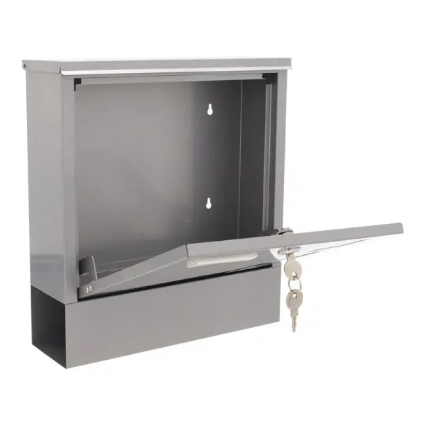 Mit dem Lago Silver bekommen Sie einen modernen Briefkasten aus hochwertigem Stahl, der Ihnen lange Freude bereiten wird. Der Posteinwurf erfolgt von oben und aufgrund der drei Sichtfenster sehen Sie auf einen Blick, ob Sie Post erhalten haben und müssen den Briefkasten deshalb zum Nachschauen nicht extra öffnen. Durch das Namensschild weiß der Briefträger/Zusteller sofort, ob er auch an der richtigen Adresse ist. Perfekt wird der Lago Silver durch die schlichte Zeitungsrolle, die optimale Ergänzung zum Briefkasten. Zylinderschloss mit 2 Schlüssel und Montagematerial sind inkl.