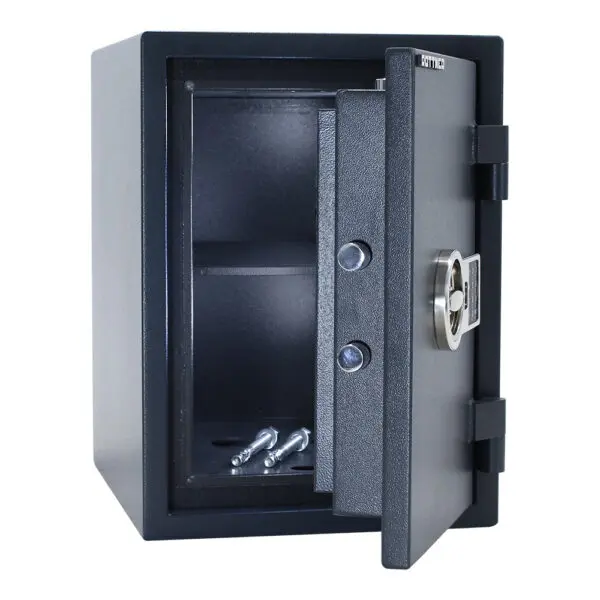 Ihre Dokumente wollen zuverlässigen Schutz gegen Diebstahl, Hitze und Feuer? Dann ist der feuersichere Dokumentenschrank Fire Hero 50 mit Elektronikschloss genau der richtige Tresor für Sie! Die massive Bauweise, Klasse 1 PN-EN 1143-1:2012 IMP mit polnischem Zertifikat und 30min Feuerschutz für Papier – das sind die Pluspunkte dieses stabilen Tresors. Der Fachboden lässt sich verstellen, sodass Sie Ihre Wertgegenstände, Sparbücher, Polizzen, Juwelen etc. bequem unterbringen können. Zur Montage verwenden Sie bitte das beiliegende Verankerungsmaterial, das im Lieferumfang enthalten ist.