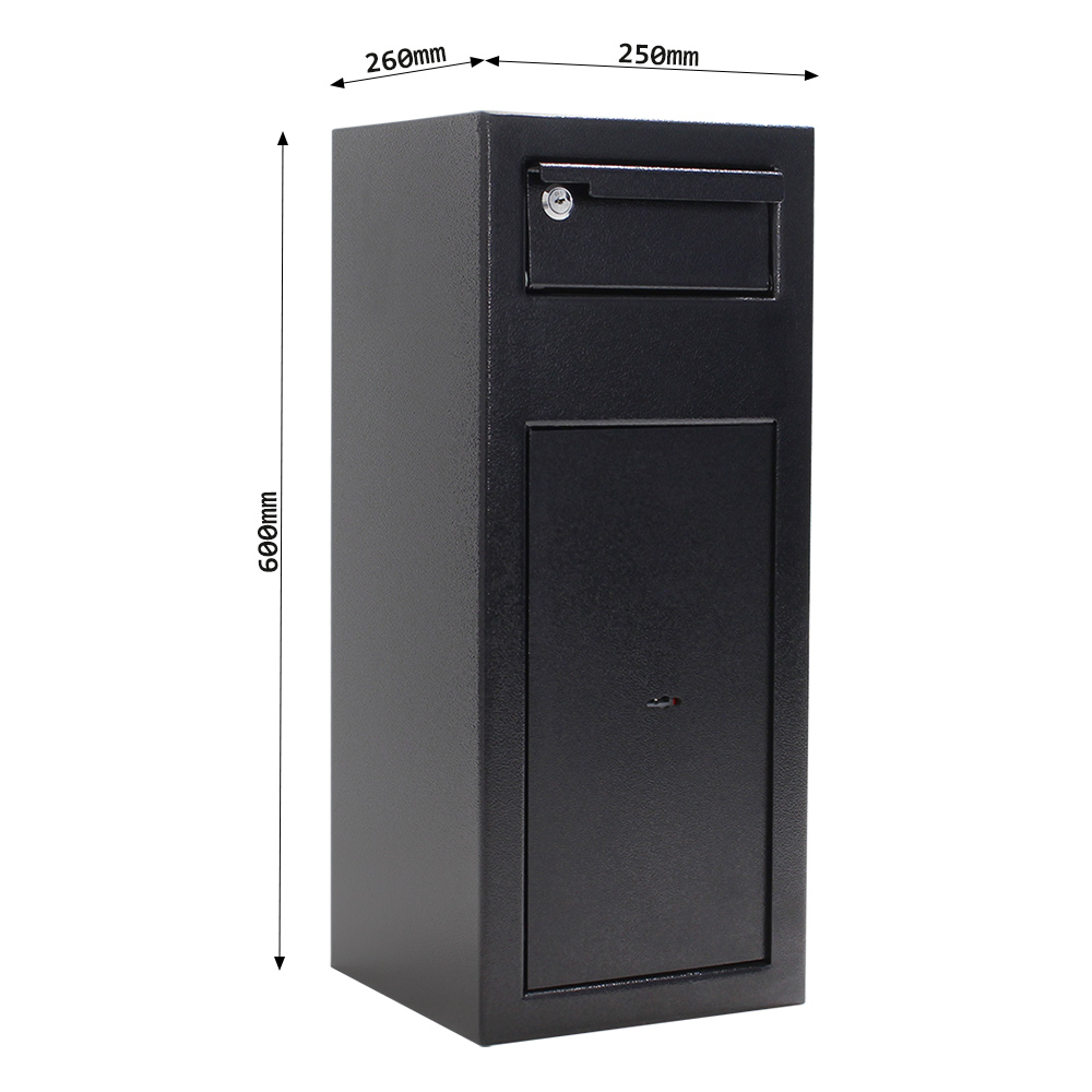 - 3 mm starke Einwurfklappe (HxBxT 20 mm x 110 mm x 270 mm) mit Zylinderschloss verschließbar (4 Schlüssel inklusive)