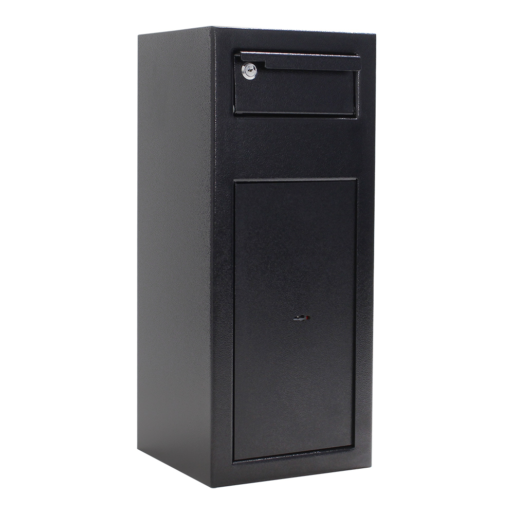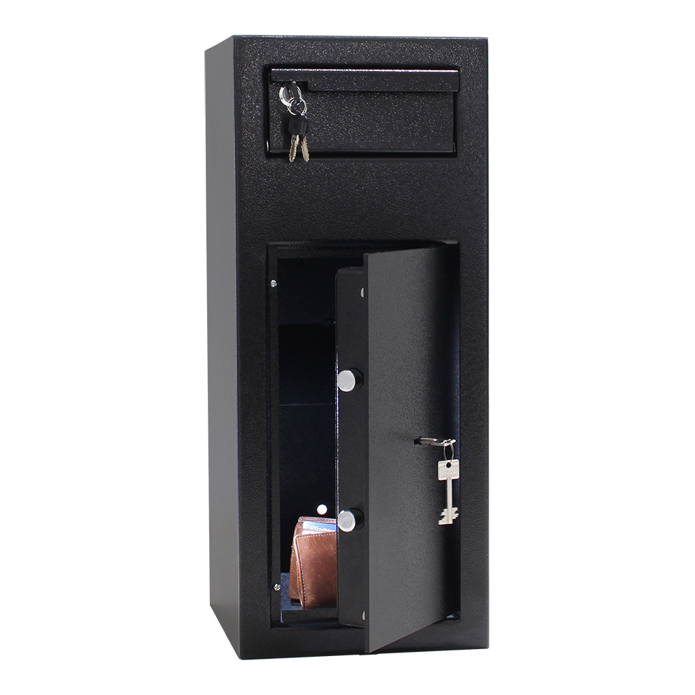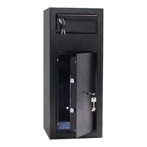 Der Rottner Einwurftresor Cashmatic 1 überzeugt nicht nur mit seinem Design und seiner Qualität, sondern auch mit der einfachen Bedienung. Sie öffnen das Zylinderschloss, ziehen die Einwurfklappe nach unten und hinterlegen die Wertgegenstände/Tageslosung etc. Durch das Gegengewicht der an der Einwurfklappe angesetzten Auflage schließt die Einwurfklappe selbständig und das Einwurfgut fällt in den Auffangschrank. Eine Rückholung durch die Einwurfklappe ist nun nicht mehr möglich. Die mit 2 stabilen Bolzen schließende Tür lässt sich mit einem Doppelbartschloss versperren. Damit Sie Ihren Einwurftresor am gewünschten Ort verankern können, finden Sie das passende Material im Lieferumfang des Tresors.