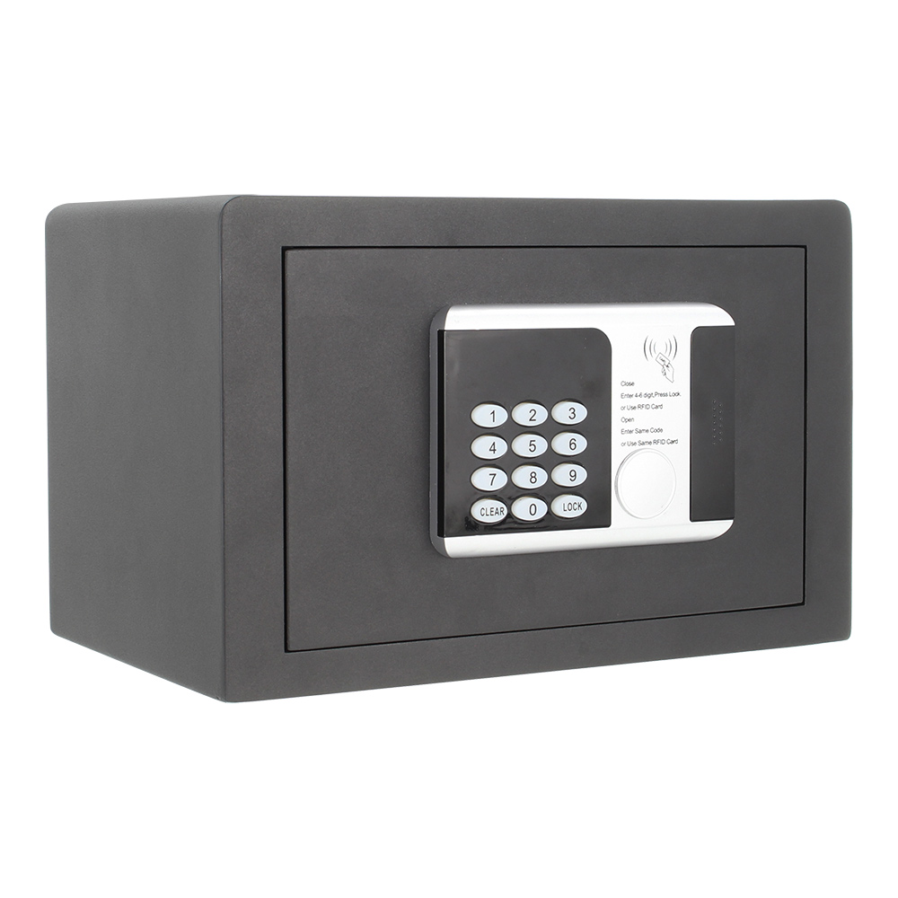 Der RFID SAFE 1 gleichsperrend eignet sich besonders gut für den Hotelbereich, aber auch für private Zwecke. Das Elektronikschloss lässt sich mit jeder Karte, die über einen RFID-Chip verfügt, öffnen oder kann mit einem Zahlencode bedient werden. Eine elektronische Notöffnung ist mittels Mastercode und eine mechanische Notöffnung per Schlüssel möglich. Nach vier Fehleingaben findet eine Sperrzeit von 5 Minuten statt. Die nötigen Batterien sind nicht im Lieferumfang enthalten. Auch das Display lässt sich ausschalten. Der Innenbereich ist beleuchtet. Ihre Versicherungswerte klären Sie bitte mit Ihrem Versicherungsberater ab. Das Öffnen und Schließen der Bolzen funktioniert automatisch, da kein Drehgriff vorhanden ist.