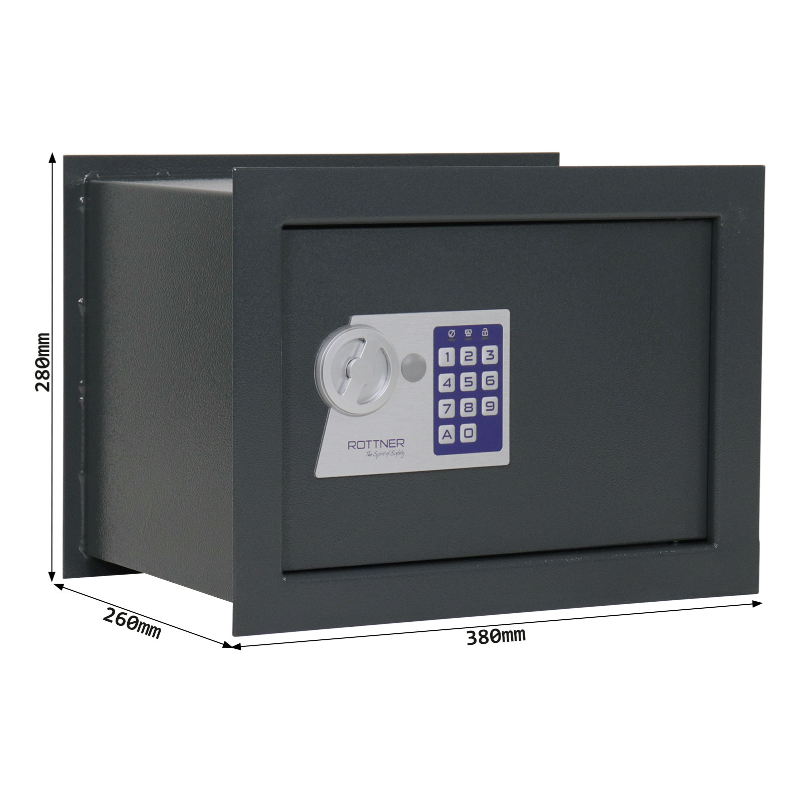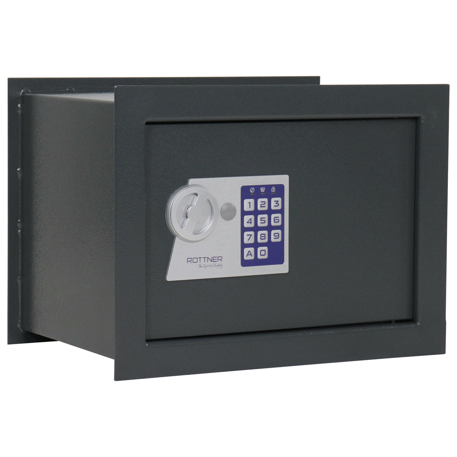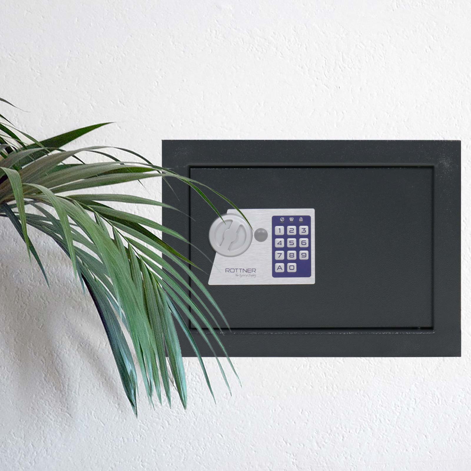 Der Rottner Elektronik Wandtresor Wallmatic 2 überzeugt durch seine Kompaktheit und das schlichte Design. Das Elektronikschloss mit leicht lesbarer Tastatur ist batteriebetrieben und hat eine mechanische Notöffnung, sodass bei Problemen mit einem Schlüssel aufgesperrt werden kann. Der Stahltresor schützt vor leichten Bränden und wird eingemauert – eine 10 cm starke Betonummantelung ist erforderlich. Ein sicherer Platz für Dokumente und Wergegenstände.