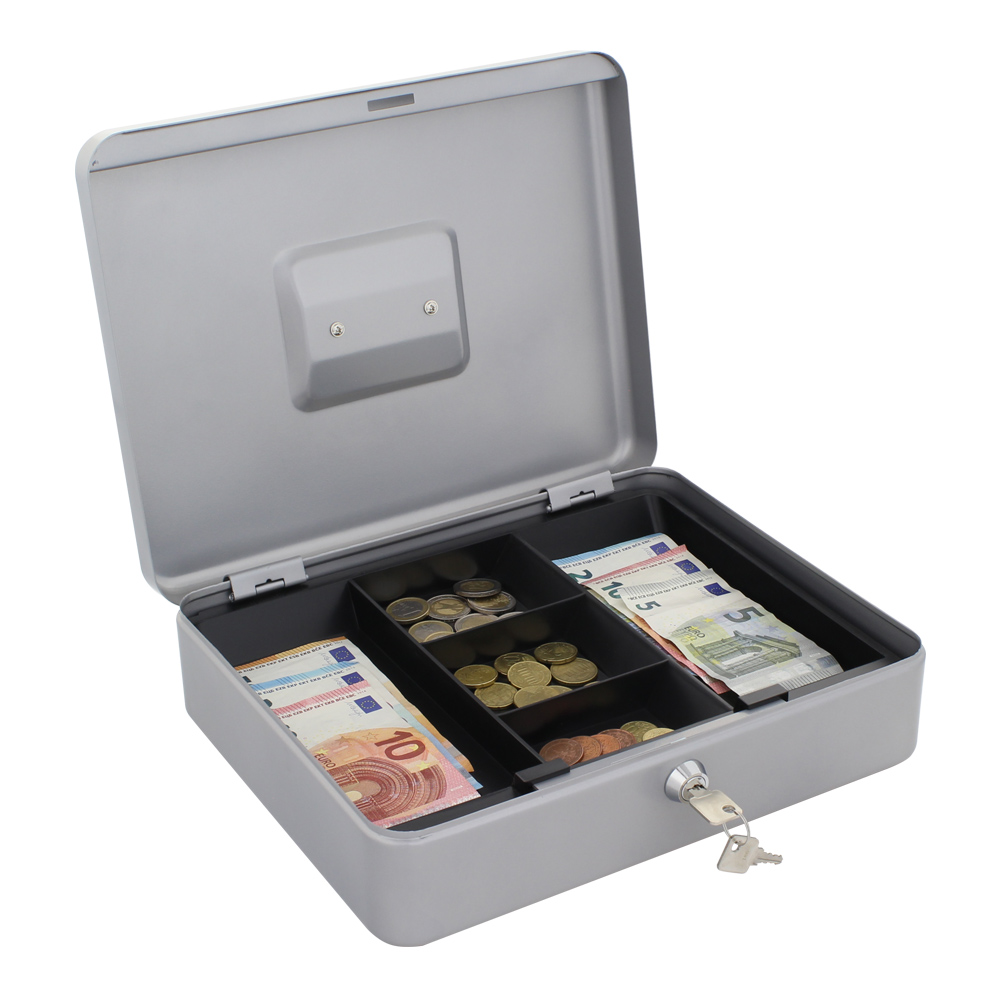 Die silberne Rottner Geldkassette HomeStar Cash 4 ist ein hervorragender Partner. Die Griffgarnitur ist versenkt, vernickelt und somit platzsparend und rostfrei. Ein Zylinderschloss mit 2 Schlüsseln sorgt für Schutz vor ungewollten Zugriffen. Das Gehäuse und der Deckel der Geldkassette bestehen aus hochwertigem Stahl.