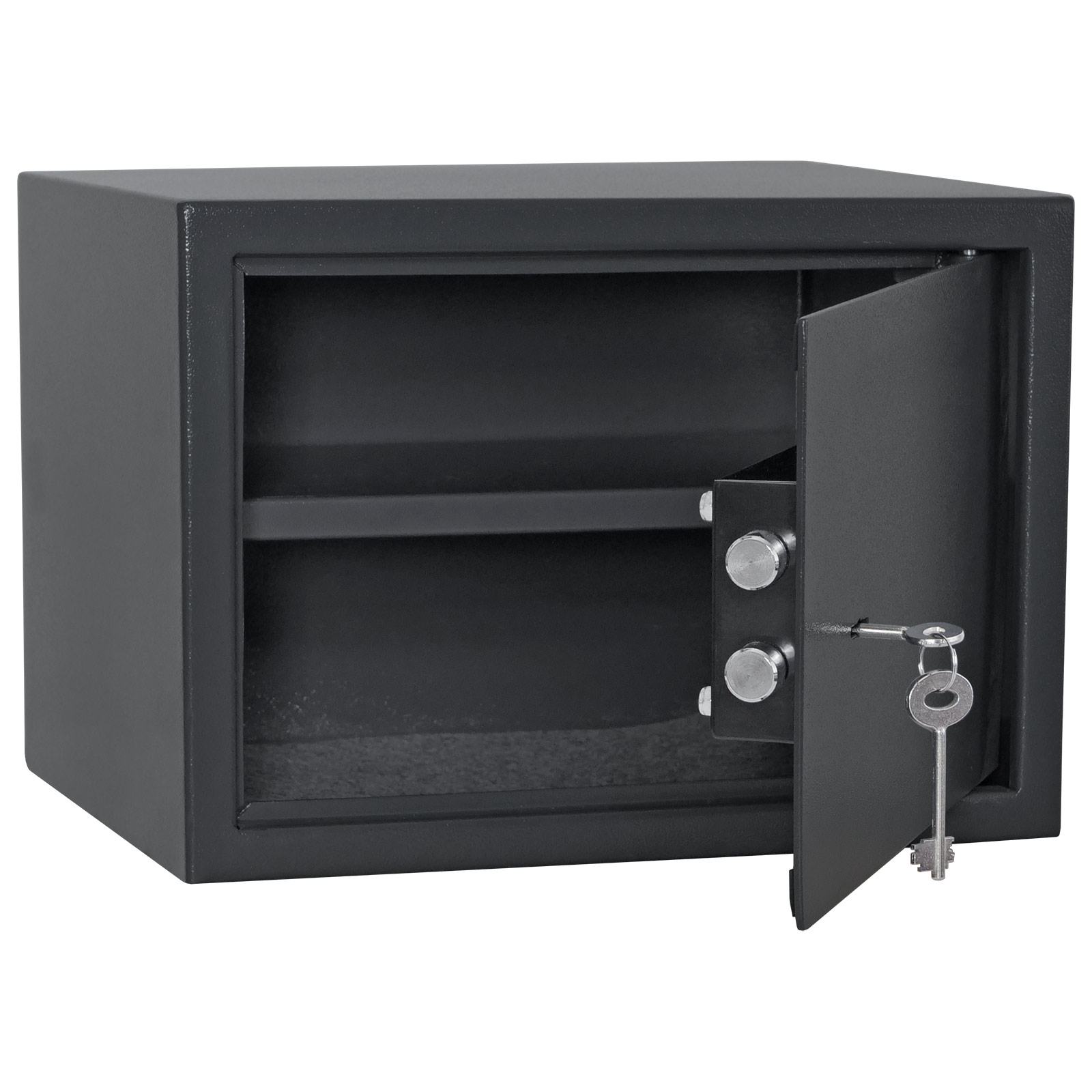 Jupiter 3 von Rottner Tresor heißt dieser kompakte Möbeltresor, der in jede noch so kleine Wohnung oder Hotelzimmer passt. Er wird in ein Möbelstück Ihrer Wahl – Schrank, Kommode, Schreibtisch – integriert und mit dem Verankerungsmaterial befestigt. Die durchgeführten Rückwand- und Bodenbohrungen erleichtern Ihnen die Montage. Auf der Bodenseite befindet sich eine Filzeinlage, die Ihre Wertgegenstände schützt. Der Fachboden kann herausgenommen werden, falls Sie etwas größere Gegenstände unterbringen möchten. Ein zweiter Schlüssel wird zum Doppelbartschloss mitgeliefert, falls Sie einen verlegen oder verlieren. Der kleine Möbeltresor kann problemlos bei einem Umzug mitgenommen werden. Die Serie Jupiter gibt es in unterschiedlichen Größen und Schlossvarianten.