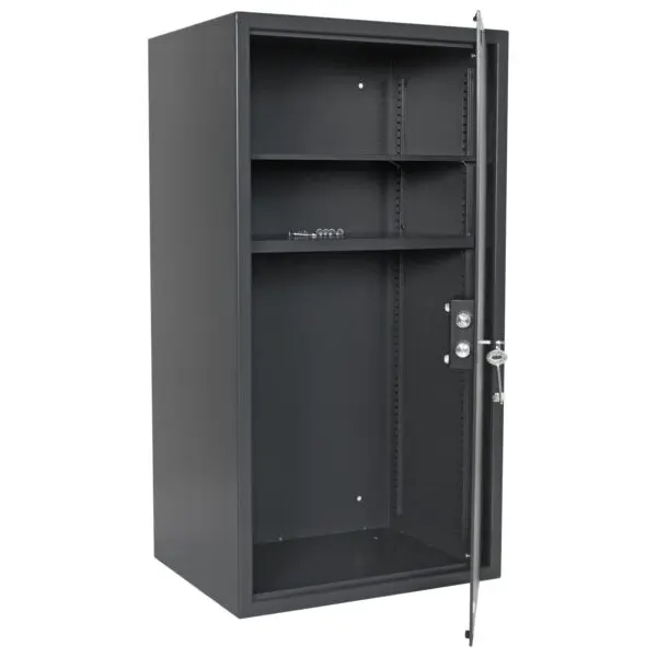 Jupiter 6 ist das größte und schwerste Modell der Serie. Die durchgeführten Rückwand- und Bodenbohrungen erleichtern Ihnen die Montage. Auf der Bodenseite befindet sich eine Filzeinlage, die Ihre Wertgegenstände schützt. Der Fachboden kann herausgenommen werden, falls Sie etwas größere Gegenstände unterbringen möchten. Ein zweiter Schlüssel wird zum Doppelbartschloss mitgeliefert, falls Sie einen verlegen oder verlieren. Der Möbeltresor kann problemlos bei einem Umzug mitgenommen werden. Die Serie Jupiter gibt es in unterschiedlichen Größen und Schlossvarianten.