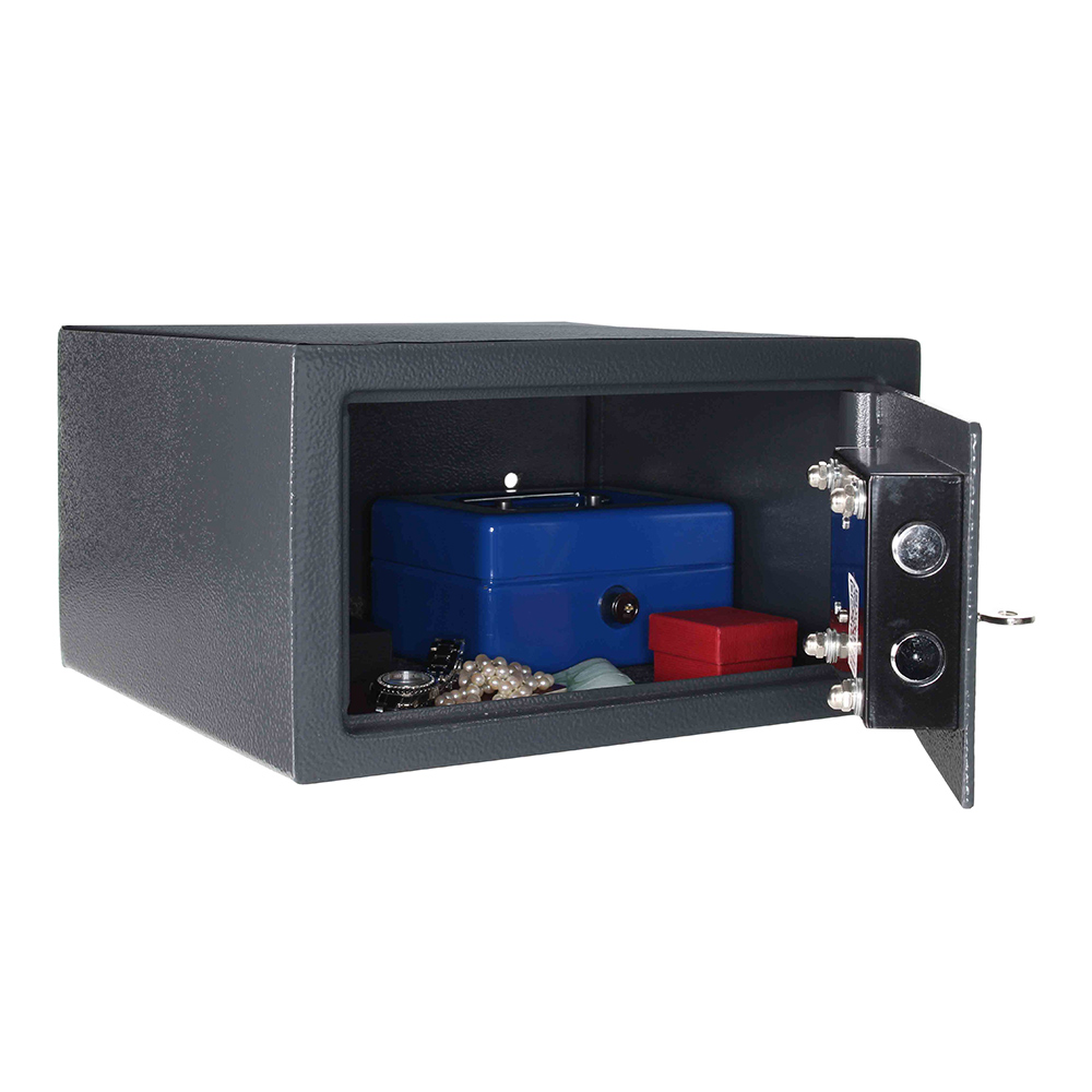 Klein und kompakt ist der Rottner Möbeltresor Saturn LE 17. Der anthrazitfarbene Tresor besticht nicht nur durch seine geringen Maße, sondern auch durch sein benutzerfreundliches Doppelbart-Sicherheitsschloss. Befestigen sie den Saturn einfach mit dem im Lieferumfang enthaltenen Montagematerial am gewünschten Platz und schon können Sie Ihren Tresor nutzen.