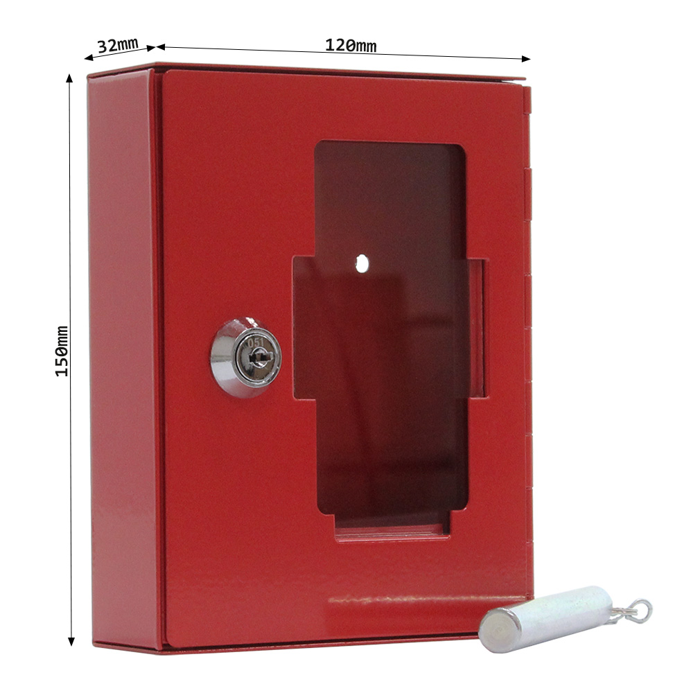 Die Scheibe wird im Notfall mit dem Klöppel eingeschlagen und der Schlüssel kann entnommen werden. Für das Zylinderschloss werden 2 Schlüssel mitgeliefert. Das Montagematerial ist im Lieferumfang enthalten. Die Glasscheibe kann ersetzt werden.
