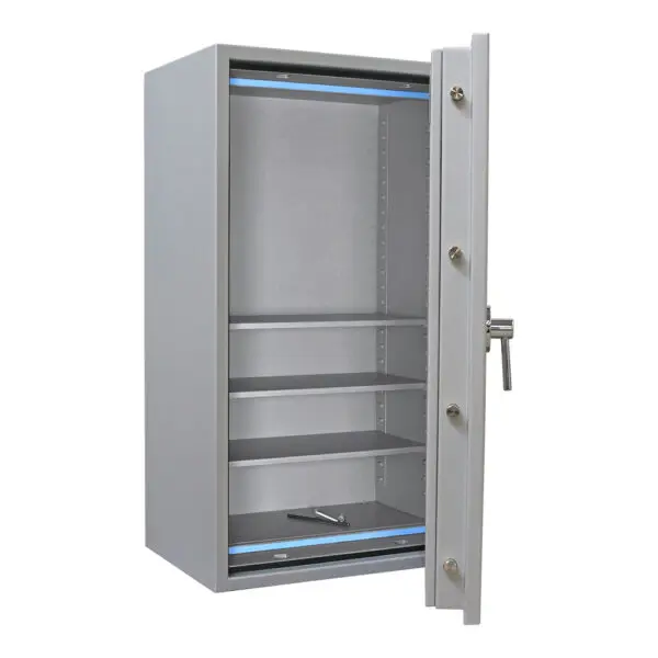 Der Rottner Papiersicherungsschrank EN1 Super Paper 120 EL überzeugt unsere Kunden durch sein schlichtes Aussehen und seine Funktionalität. Das batteriebetriebene Elektronikschloss ist leicht in der Handhabung und kann im Notfall mit einer 9 Volt Blockbatterie notbestromt werden. Dieses Modell verfügt über eine geprüfte Einbruchsicherheit der Klasse VdS-1 sowie einen geprüften Feuerschutz der Klasse S 60 P, beste Voraussetzungen für Sicherheit im Büro. 21 Ordner können Sie auf drei verstellbaren Fachböden unterbringen.