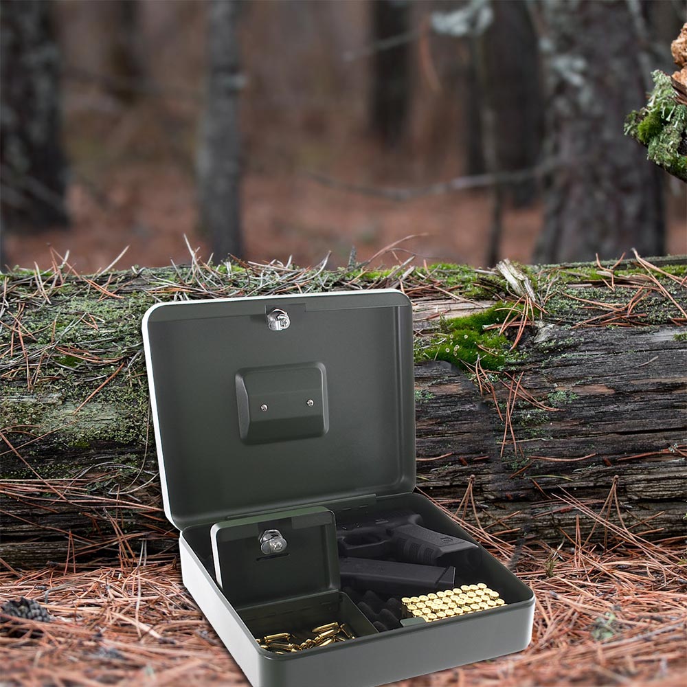 Zur sicheren Aufbewahrung Ihrer Pistolen bietet sich die Pistolenkassette Gunbox aus hochwertigem Stahl an. Eine Schaumstoffeinlage bietet besondern Schutz für Ihre Waffen. Weiters gibt es eine kleine Extra-Kassette mit Einwurfschlitz für Zubehör. Beachten Sie bitte, dass die Gun Box in Deutschland nur zur Munitionsaufbewahrung verwendet werden darf!