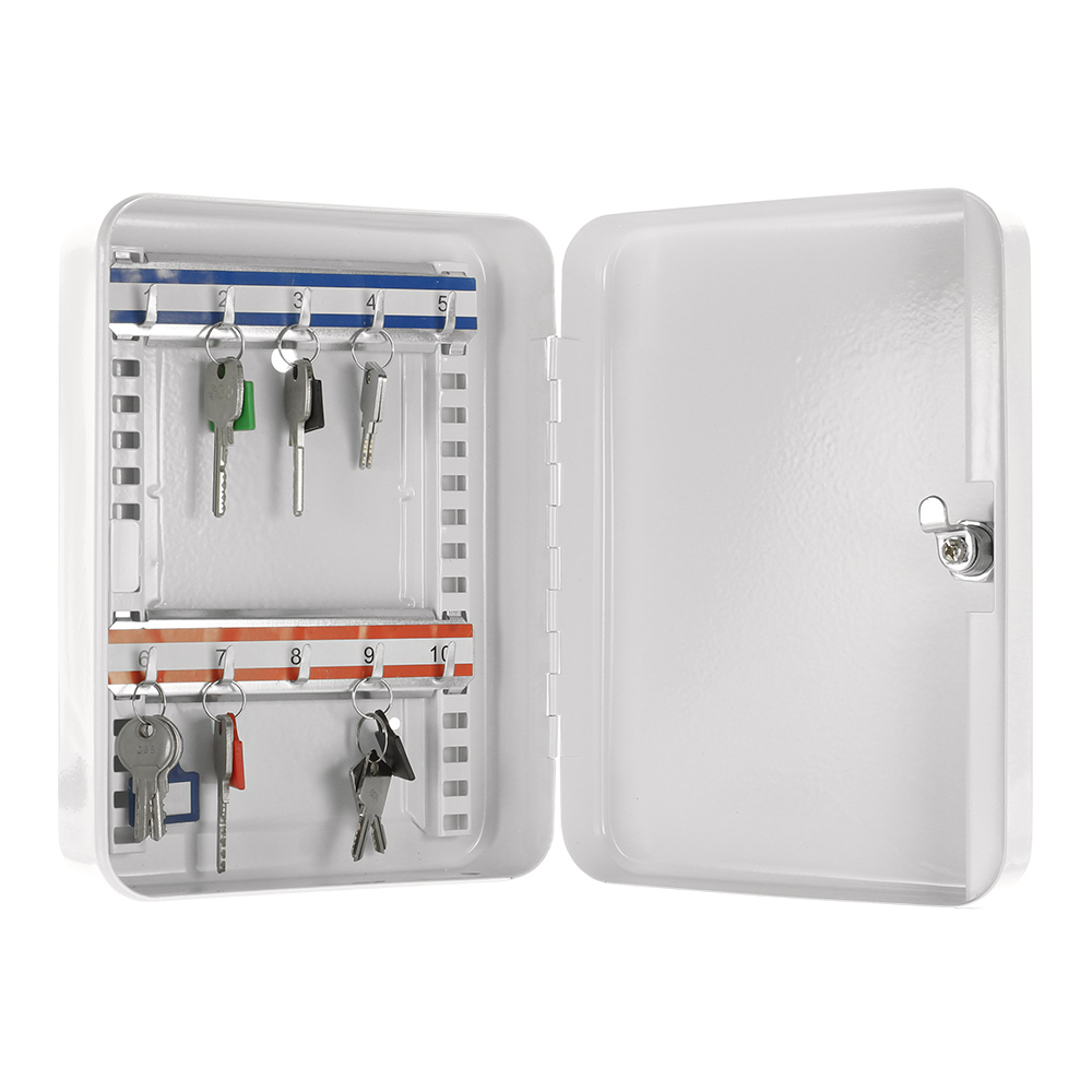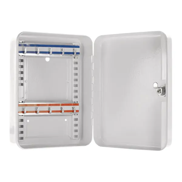 Sie brauchen Ihre Schlüssel nicht mehr suchen – diese sind ab jetzt ordentlich und sicher in der kleinen praktischen Schlüsselkassette SK 10 von Rottner Tresor aufgehoben. Die Schlüsselbox besitzt ein Zylinderschloss inkl. 2 Schlüssel. Das Gehäuse und die Tür sind aus Stahlblech gefertigt. Auf zwei fortlaufend nummerierten Hakenleisten, die im Rastersystem verstellbar sind, können Sie 10 Schlüssel aufbewahren. Eine sinnvolle Anschaffung für Ihr Zuhause!