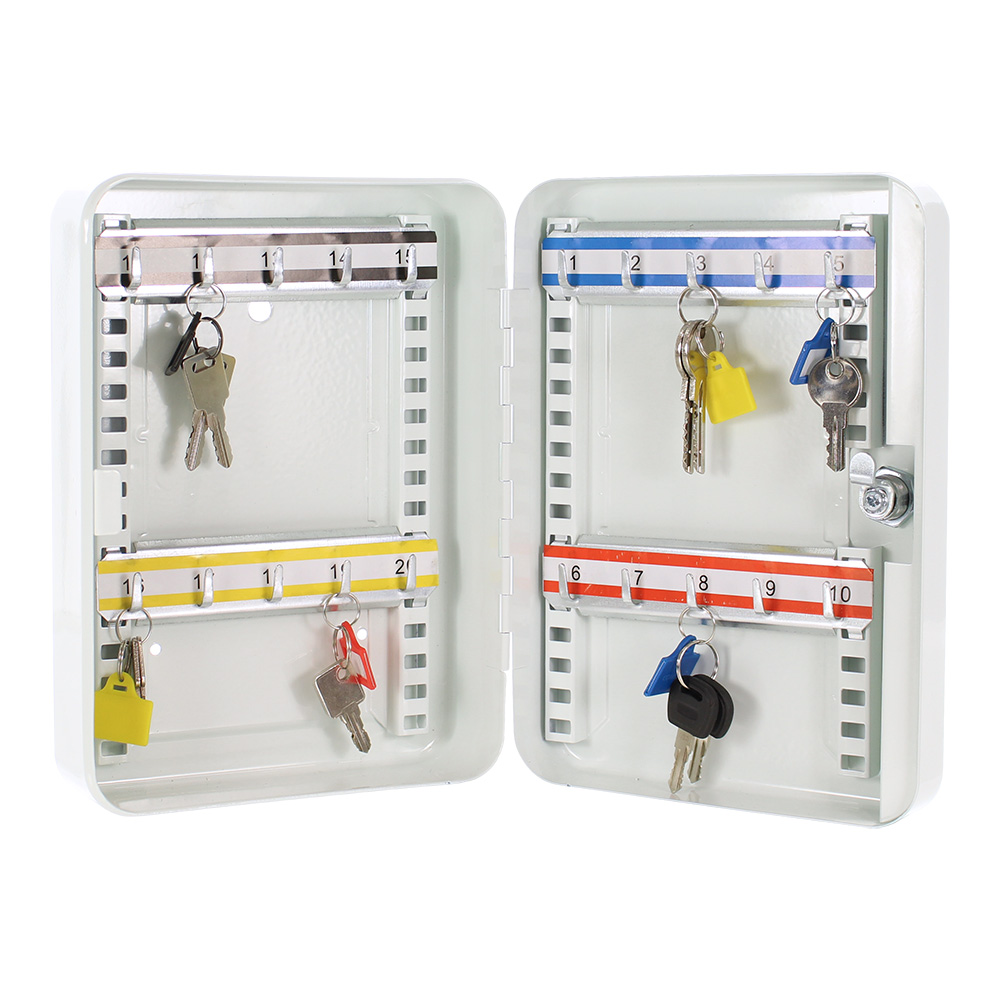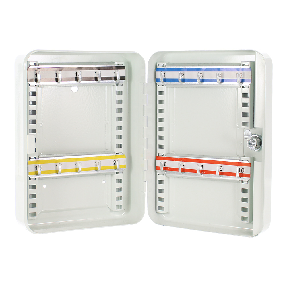 Sie brauchen Ihre Schlüssel nicht mehr länger suchen – diese sind ab jetzt ordentlich und sicher in der kleinen praktischen Schlüsselkassette SK 20 von Rottner Tresor aufgehoben. Die Schlüsselbox besitzt ein Zylinderschloss inkl. 2 Schlüssel. Das Gehäuse und die Tür sind aus Stahlblech gefertigt. Auf vier fortlaufend nummerierten Hakenleisten (im Rastersystem verstellbar) können Sie 20 Schlüssel aufbewahren. Eine sinnvolle Anschaffung für Ihr Zuhause!