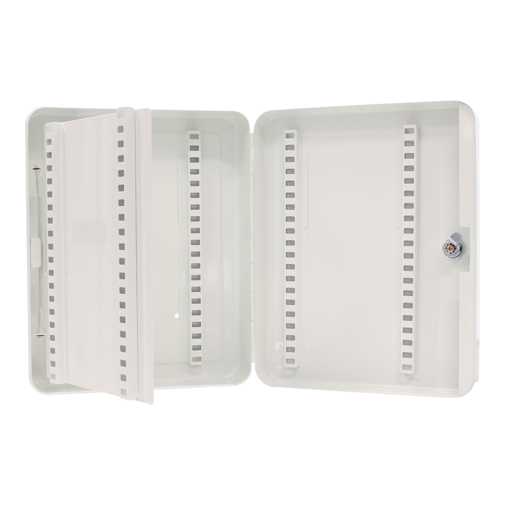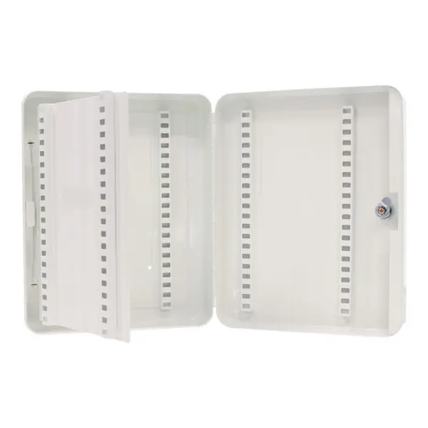 Viel Platz für Ihre Schlüssel und doch kompakt, das ist die Schlüsselkassette SK 40 von Rottner Tresor. Die schwenkbare Zwischenwand erleichtert das Auffinden der Schlüssel, ebenso die Durchnummerierung und die farblichen Leistenetiketten. So gelingt eine perfekte Übersicht. Der Schlüsselkasten wird mit einem Zylinderschloss inkl. 2 Schlüssel ergänzt und ist für die Wandmontage vorgesehen, inkl. Material.