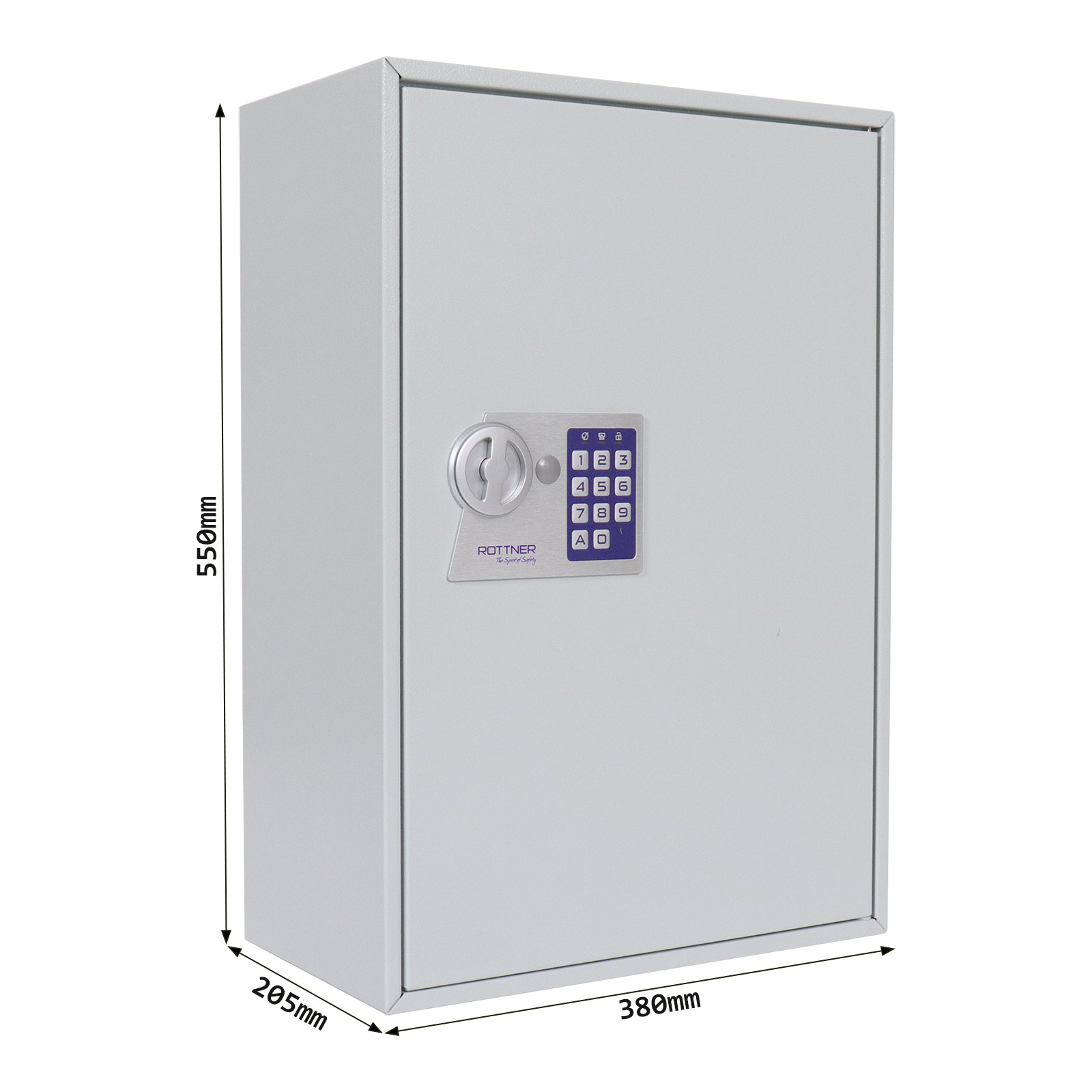 Der Rottner Schlüsselschrank S 250 mit Elektronikschloss ist ein batteriebetriebener Tresor, für Schlüsselbewahrung geeignet und zur Wandmontage vorgesehen. Unsere Hakenleisten sind im Rastersystem verstellbar und alle Modelle sind mit schwenkbarem Schlüsselregister ausgestattet. Montagematerial wird kostenlos mitgeliefert und zusätzlich bekommen Sie GRATIS mit jedem Schrank, je nach Hakenzahl, Schlüsselanhänger.