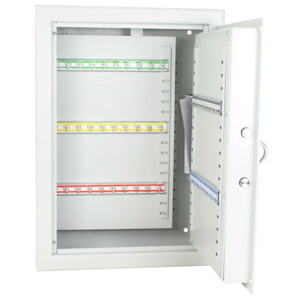 Vertrauen Sie auf den Rottner Schlüsseltresor ST 150 Premium mit Elektronikschloss. Er schützt Ihre Schlüssel zuverlässig vor ungewollten Zugriffen. Sein allseitig einwandiger Korpus und seine doppelwandige Tür sind von bester Qualität. Die Hakenleisten im Inneren sind verstellbar. 150 Haken haben darauf Platz. Eine Zwischenwand im Inneren sorgt für Übersicht und Ordnung. Das Elektronikschloss besitzt keine Schlüsselöffnung, kann jedoch von außen notbestromt werden.