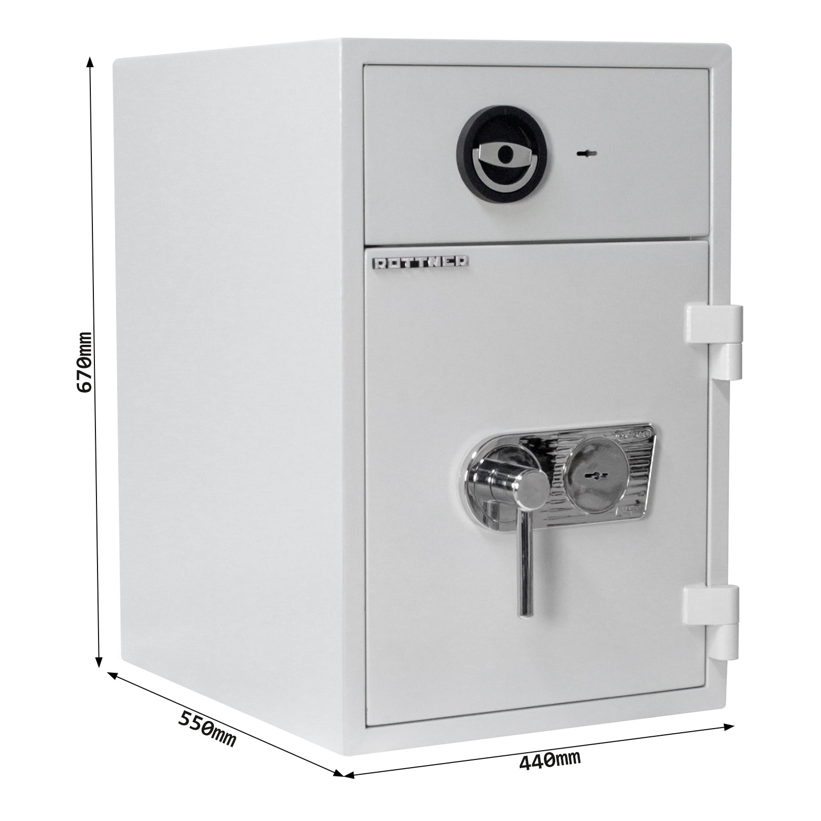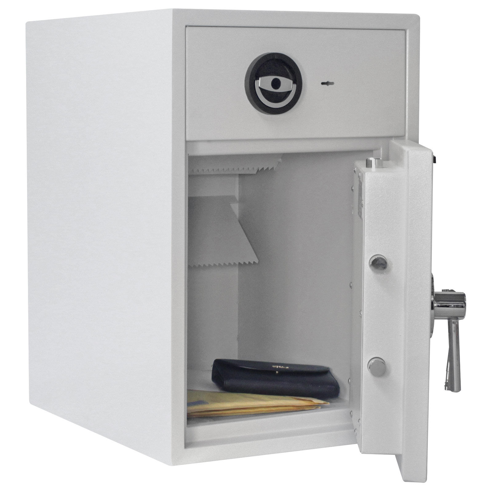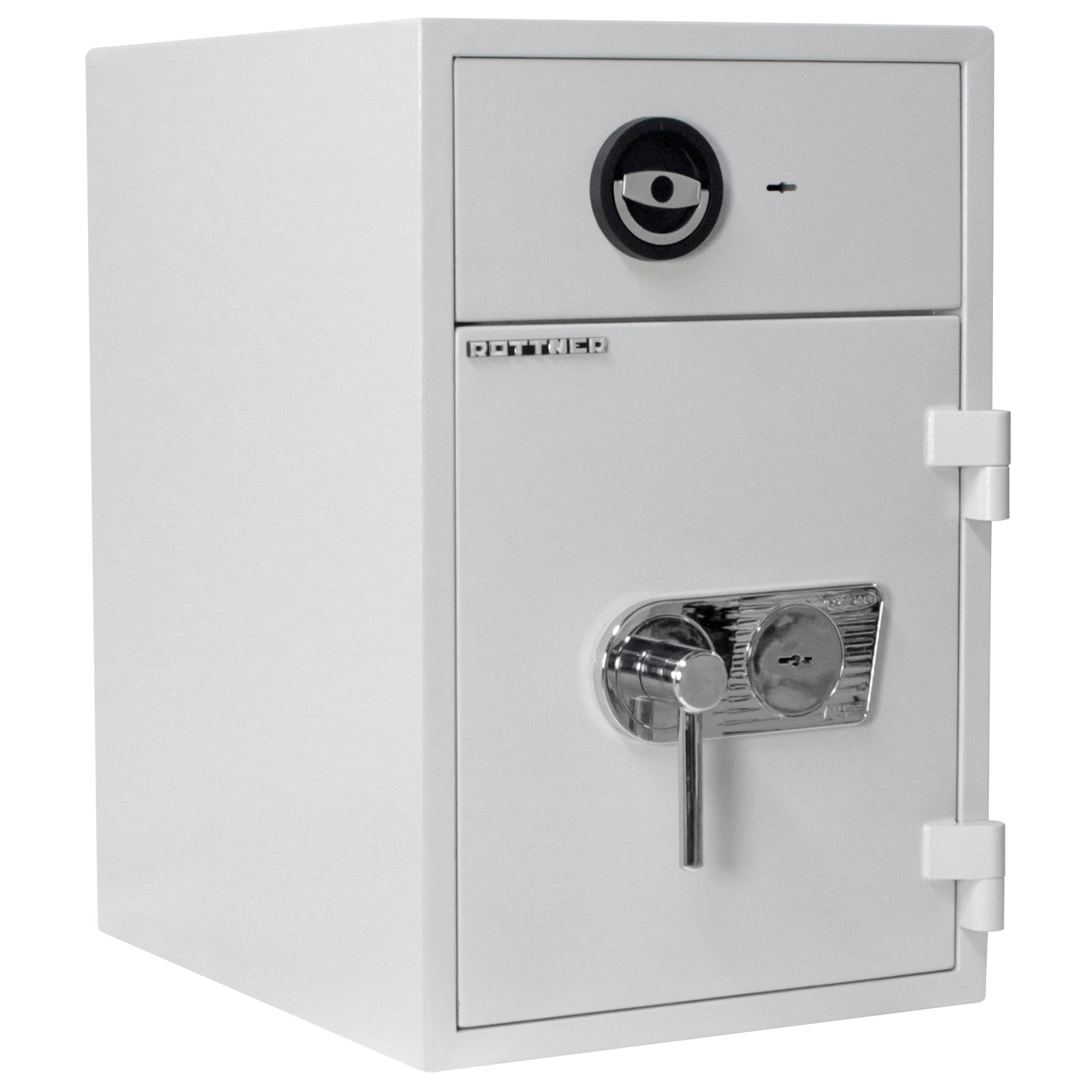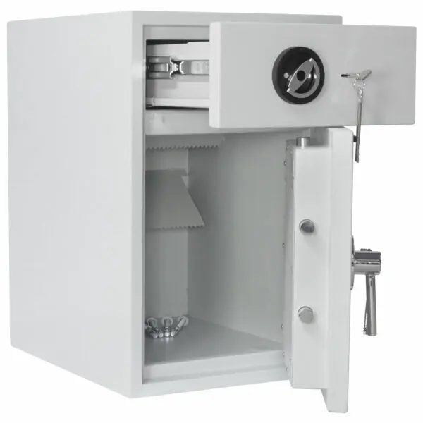 Der Rottner Schubladentresor sorgt für Sicherheit und schützt vor ungewollten Zugriffen. Der Auffangtresor und die Schublade sind mit einem Doppelbartschloss der Schlossklasse A ausgestattet. Ein Einwurftresor dient zum Hinterlegen von Geld (z.B. Tageslosung), ohne dass man den Safe öffnen muss. Das Geld/Dokumente werden in die Schublade gegeben und gelangen so ins Innere des Tresors. Eine Rückholsperre verhindert die Entnahme des Geldes. Der Empfänger (z.B. Firmenchef) muss den Auffangtresor öffnen, um zum Geld/Dokumenten zu gelangen.