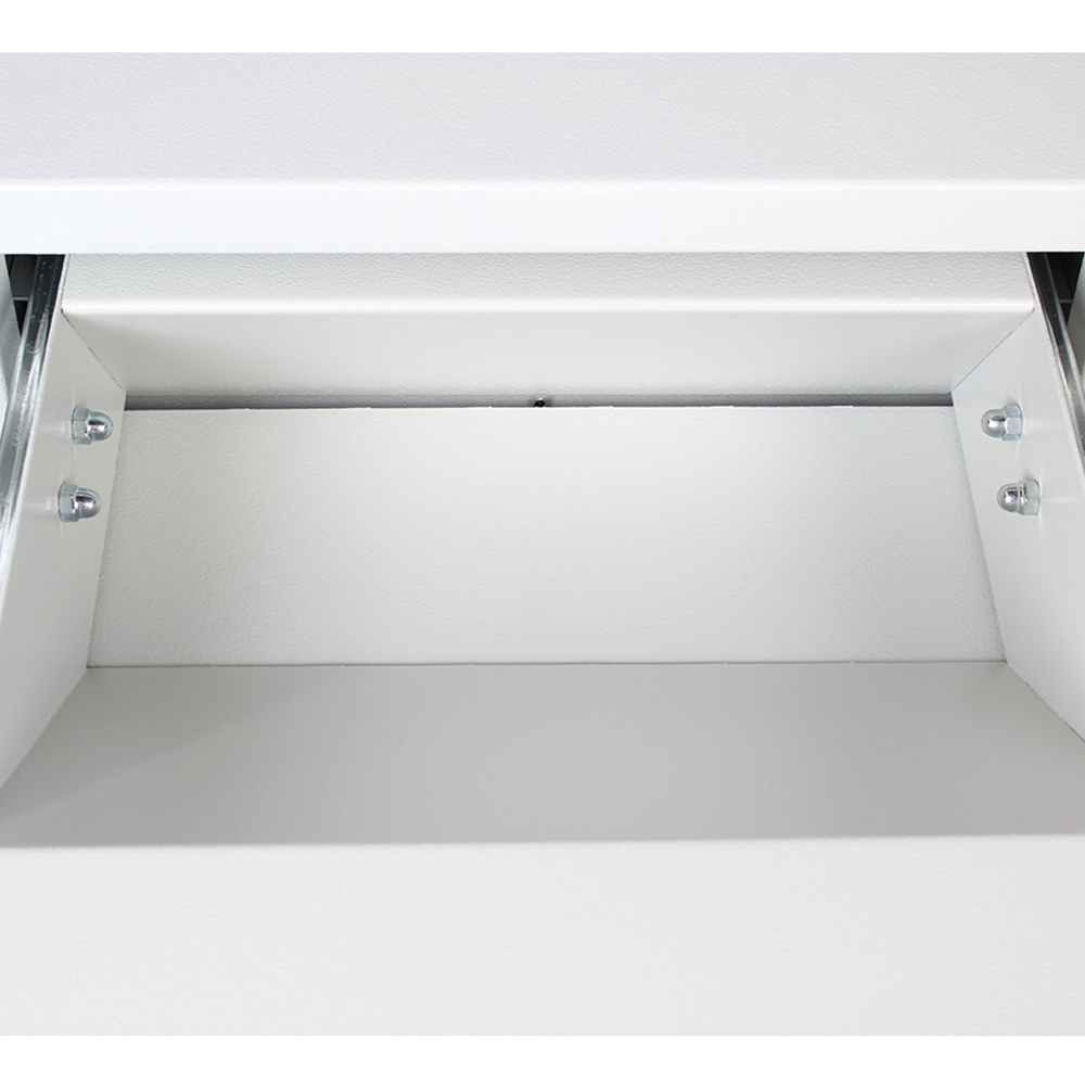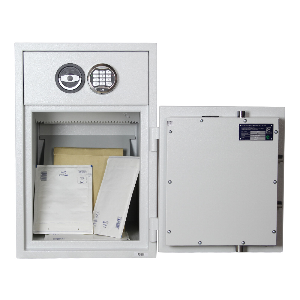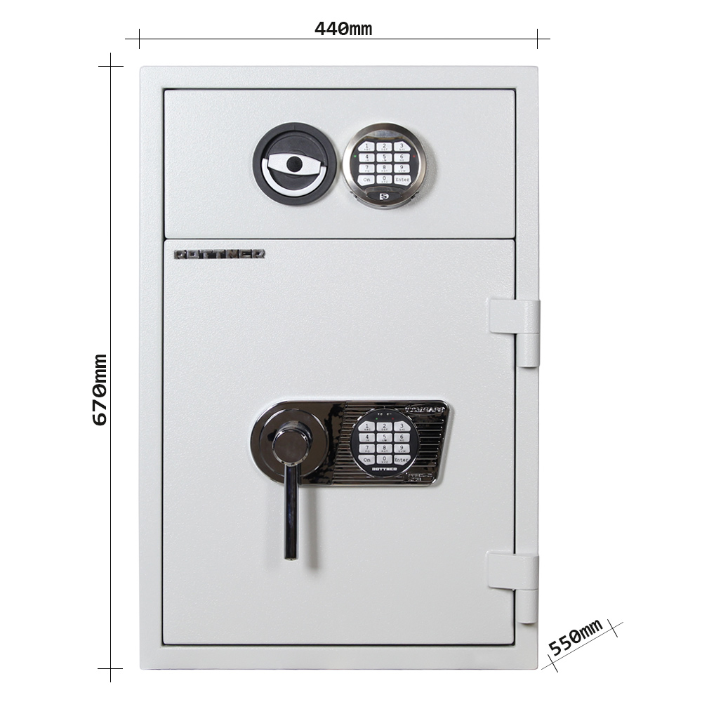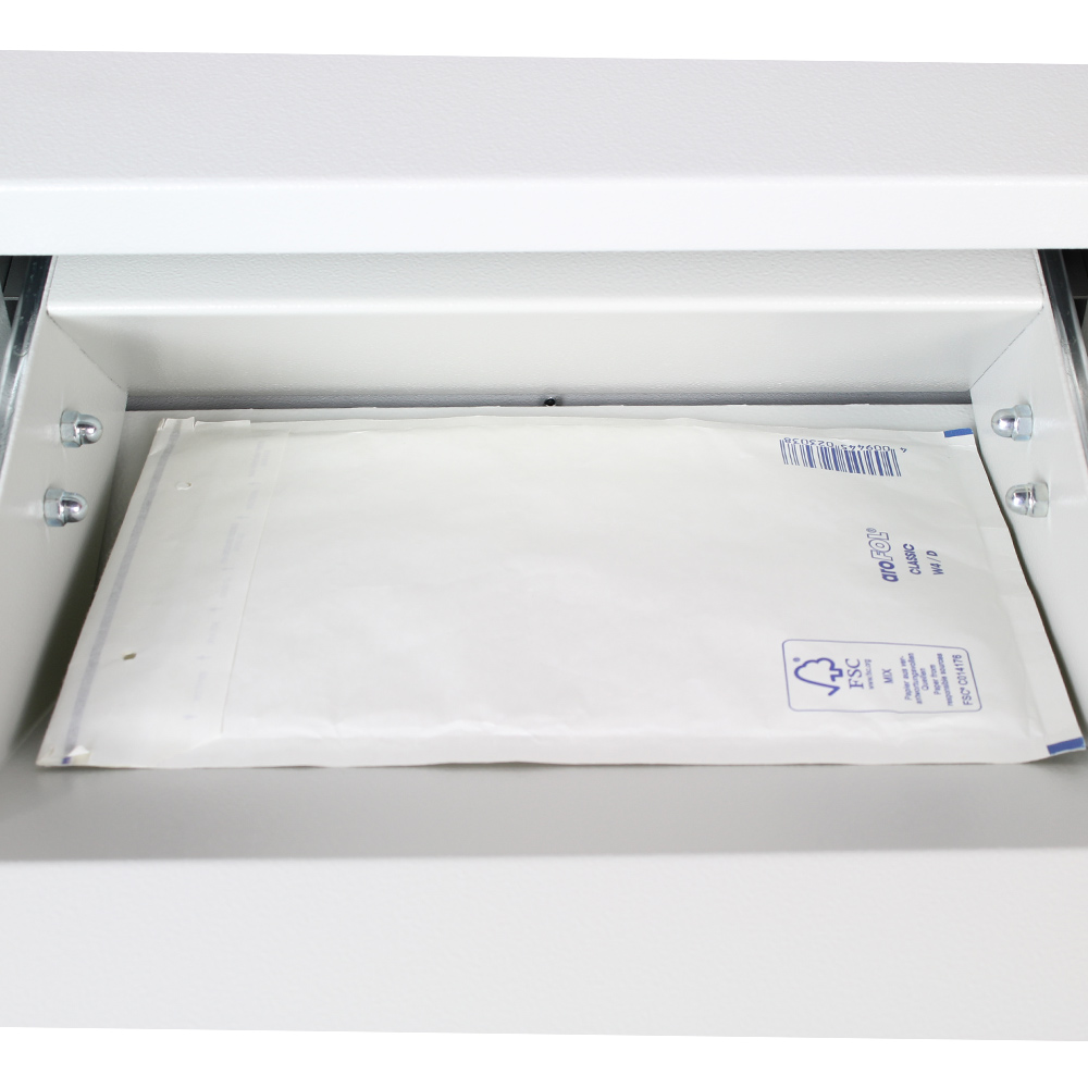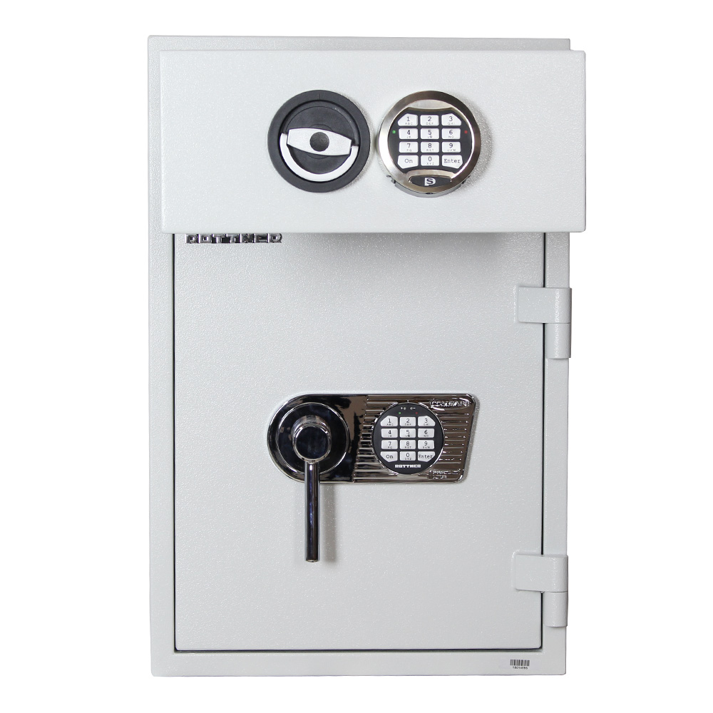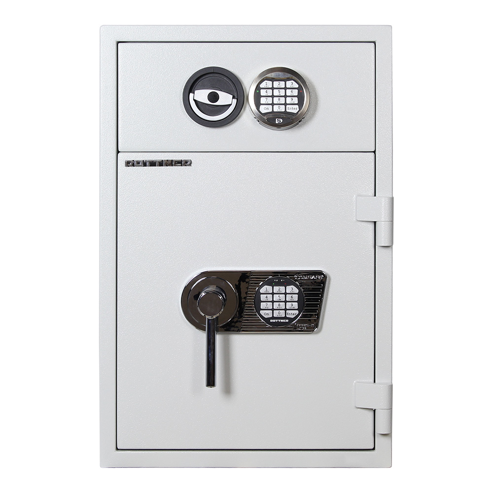Der Rottner Schubladentresor-D1 65 EL/EL ist mit zwei batteriebetriebenen Elektronikschlössern ausgestattet, eines für die Schublade und eines für den Auffangtresor. Ein Einwurftresor eignet sich, wenn z.B. ein Mitarbeiter eine Tageslosung hinterlegen soll. Er kann das Kuvert einfach in der Schublade hinterlegen und es gelangt ins Innere des Safes. Die Anti-fishing Anlage (eine Rückholsperre) verhindert die Entnahme des Geldes. Der Empfänger öffnet mit seinem Code den Auffangtresor und kommt so zum Inhalt. Der Schubladentresor hat einen geprüften Einbruchschutz. Die Schublade ist nach vorne ausgerichtet