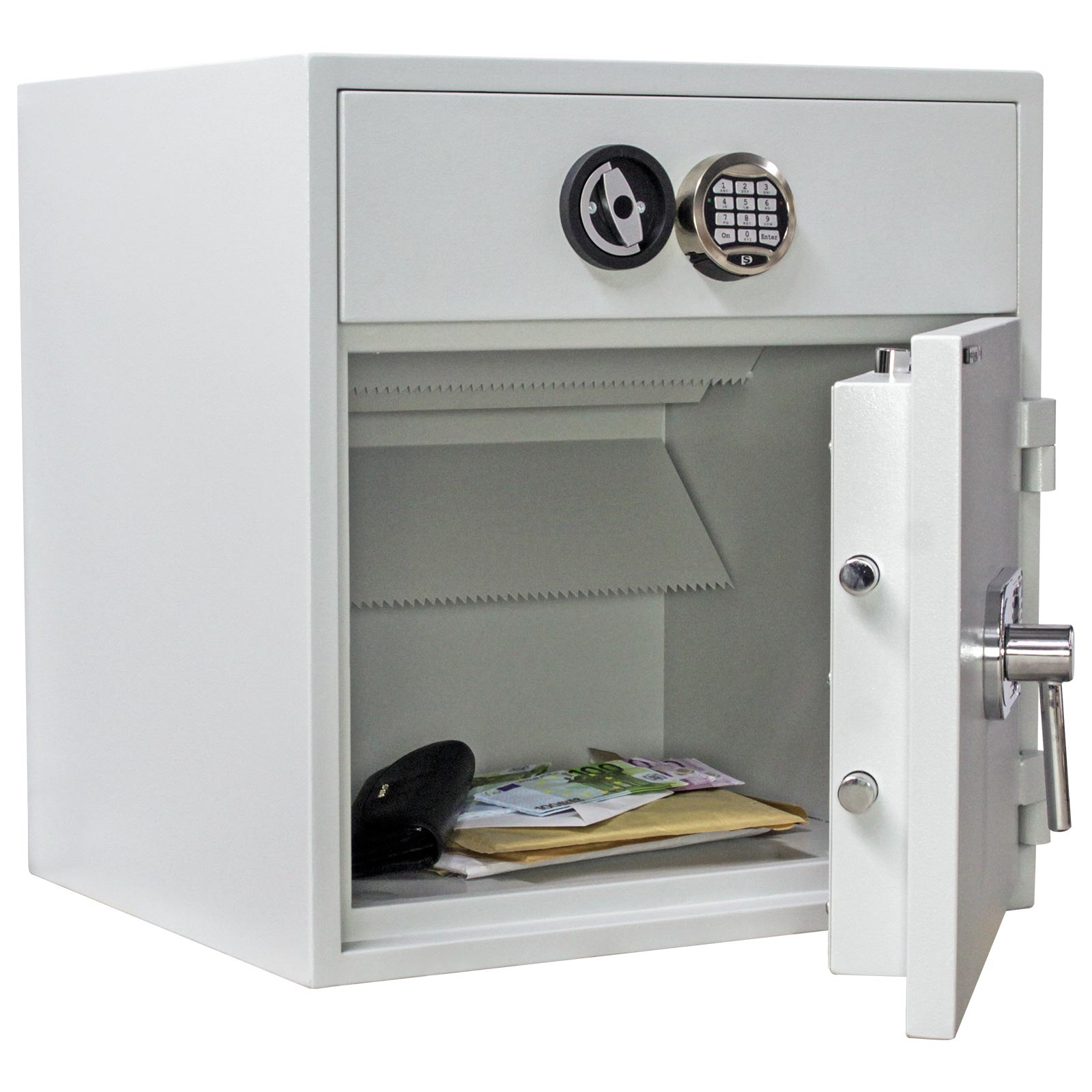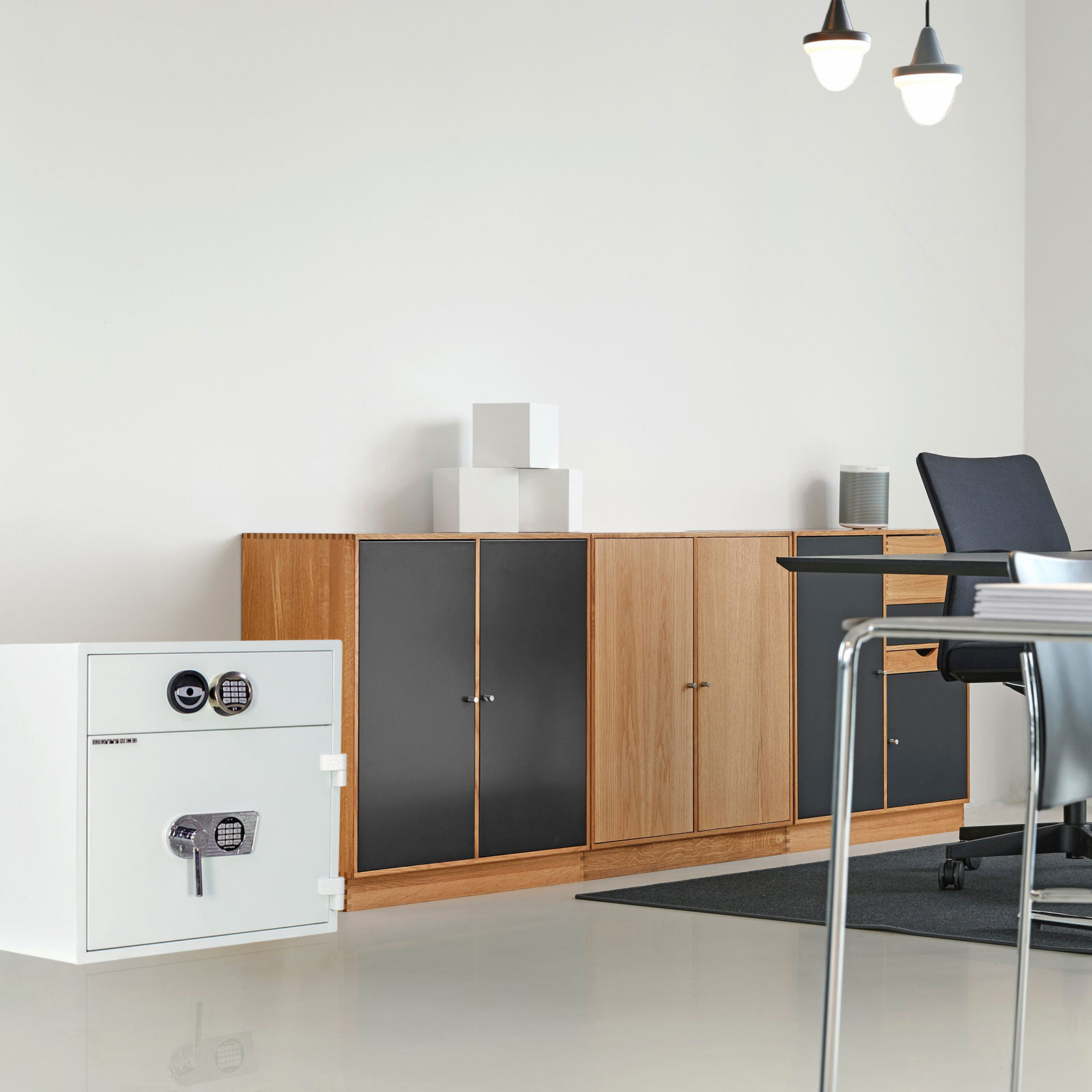 • Erhältlich auch mit mechanischem Zahlenkombinationsschloss oder Doppelbartsicherheitsschloss (inkl. je 2 Schlüssel) bei Auffangtresor und/oder Schublade