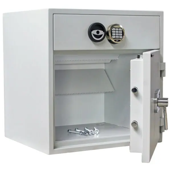 Der Rottner Schubladentresor sorgt für Sicherheit und schützt vor ungewollten Zugriffen. Die Elektronikschlösser sind einfach in der Bedienung und können notbestromt werden. Der Tresor verfügt über eine 3-seitige Bolzenverriegelung und das Schloss ist bohrgeschützt. Die Schublade ist nach vorne ausgerichtet. Eine Bodenbohrung ist bereits durchgebohrt, das Verankerungsmaterial ist im Lieferumfang enthalten.