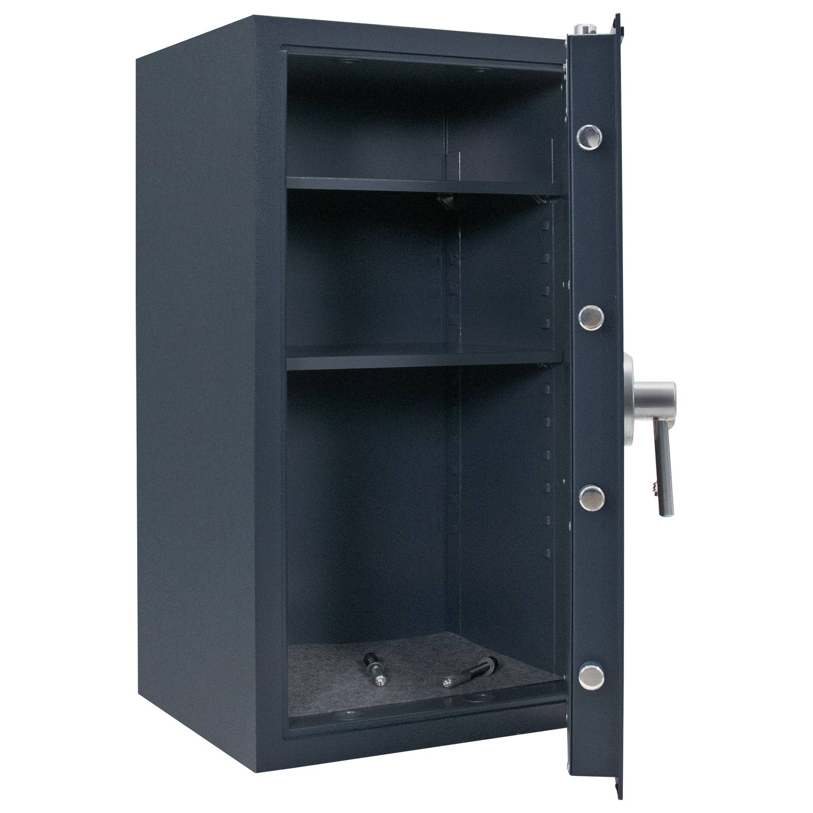Der Rottner Wertschutzschrank Samoa 85 mit Doppelbartschloss entspricht den Bestimmungen der Sicherheitsklasse EN-0 und bietet auch einen begrenzten Feuerschutz, da sich ein Feuerfalz in der Türöffnung befindet. Aufgrund der Sicherheitsstufe können auch Waffen gelagert werden. Sein Doppelbart-Hochsicherheitsschloss wird durch einen Schlossschutzpanzer aus Mangan-Hartstahl geschützt und ist einfach zu bedienen.2 Fachböden, die in der Höhe verstellbar sind, erleichtern die Aufteilung der Wertgegenstände. Das für die Verankerung geprüfte Material finden Sie im Lieferumfang.