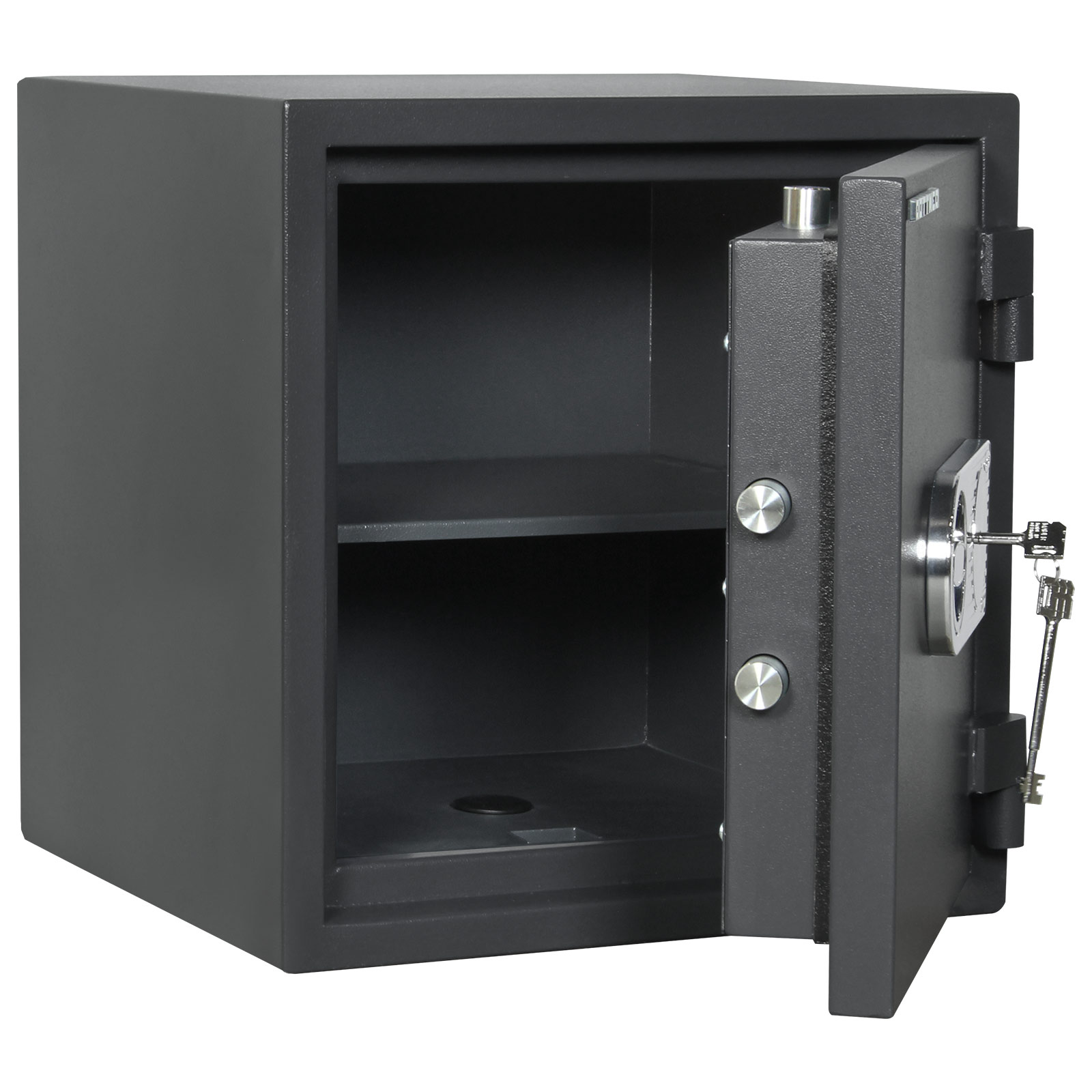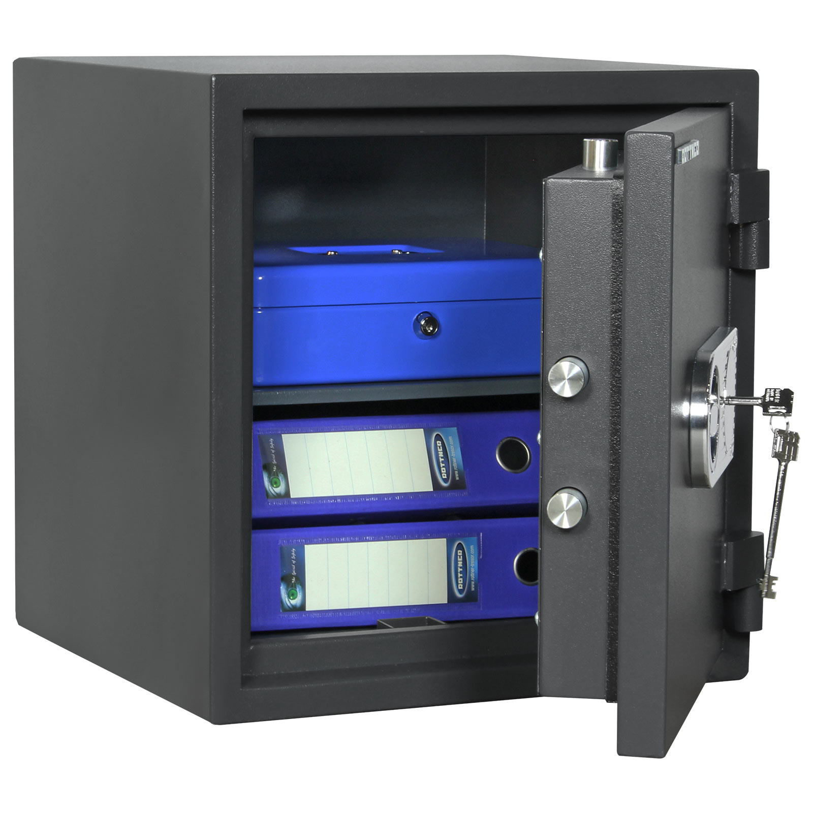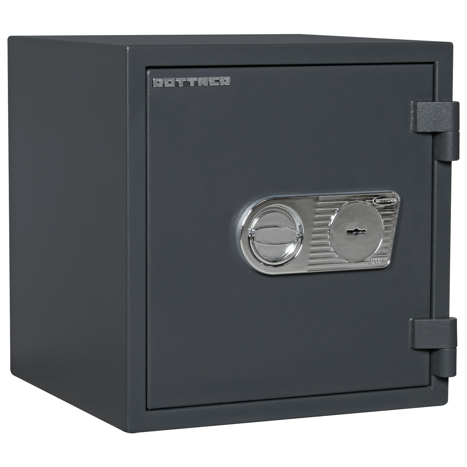 Wertgegenstände, Schmuck, Dokumente, Sparbücher oder auch Kurzwaffen fühlen sich im Rottner Wertschutzschrank EN1 Atlas 45 Fire besonders sicher. Der Tresor ist mit einem 30 minütigem Feuerschutz für Papier ausgestattet und besitzt einen zertifizierten Einbruchschutz. Der Fachboden im Inneren ist verstellbar und bietet Platz für 5 Ordner. Das Doppelbartschloss ist einfach zu bedienen. 2 Schlüssel und das Montagematerial sind im Lieferumfang enthalten.