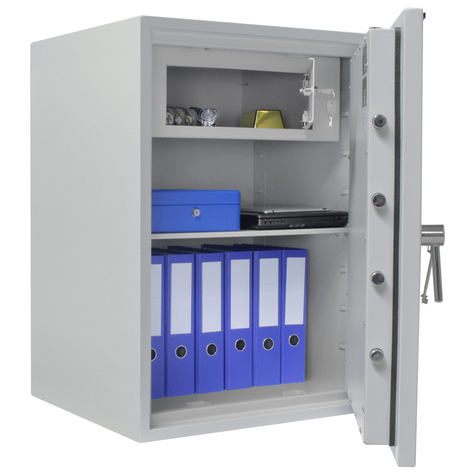 Der geräumige Wertschutzschrank von Rottner mit Doppelbartschloss beeindruckt durch seine hervorragende Qualität. Geprüfter Einbruchschutz und Feuersicherheit für 30 Minuten für Papierdokumente sind gegeben. 2 verstellbarer Fachböden erwarten Sie im Inneren, Platz für 14 Ordner, und ein versperrbarer Innentresor für kleine Wertgegenstände. 2 Schlüssel für das Doppelbartschloss und das Montagematerial sind im Lieferumfang enthalten.