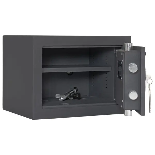 Der Rottner Wertschutzschrank Toscana 26 ist ein kleiner, der Sicherheitsstufe EN-1 nach CSN EN-1 1143-1 entsprechender Tresor mit bedingtem Feuerschutz durch ringsumlaufenden Feuerfalz. Eine einfache Handhabung verspricht das Doppelbartschloss mit Aufbohrschutz inkl. 2 Schlüssel. Für den leichten Überblick über die Wertgegenstände und Dokumente in seinem Inneren sorgt der verstellbare Fachboden. Aufgrund der Sicherheitsstufe können Sie auch Kurzwaffen lagern. Mit dem Toscana 26 haben Sie den optimalen Schutz für Ihre Dokumente und Wertpapiere.