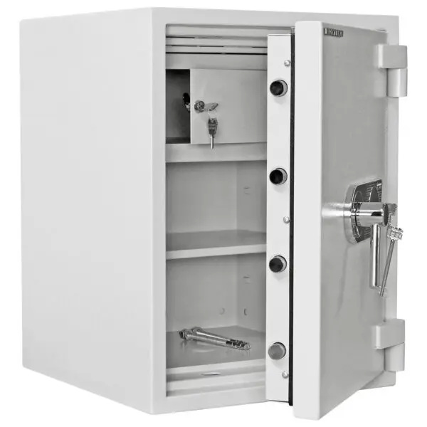 Der Rottner Wertschutzschrank EN 2 Diamant Fire Premium PO 65 mit Doppelbartschloss besitzt nicht nur einen geprüften Einbruchschutz, sondern auch einen 30-minütigen Schutz vor Feuer. Der massive Dokumentenschrank mit seinem herausnehmbaren Innentresor und seinem verstellbaren Fachboden bietet für bis zu 7 Ordner oder diverse Bürounterlagen, Polizzen und Dokumente Platz. Ein herausnehmbarer Innentresor hat den Vorteil, dass der Platz auch anderweitig genützt werden kann. Sie können also entweder Kleinigkeiten in den Innentresor geben oder z.B. anstelle des Innentresors Ordner etc. unterbringen. Der Innentresor ist angeschraubt und lässt sich im versperrten Zustand nicht herausheben. Dies geht nur, wenn er geöffnet ist und Sie die diesbezüglichen Schrauben herausdrehen. Das für die Bodenverankerung benötigte Material finden Sie im Lieferumfang des Tresors vor. Vorbereitungen für eine Einbruchmeldeanlage sind durchgeführt.